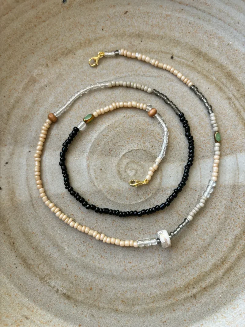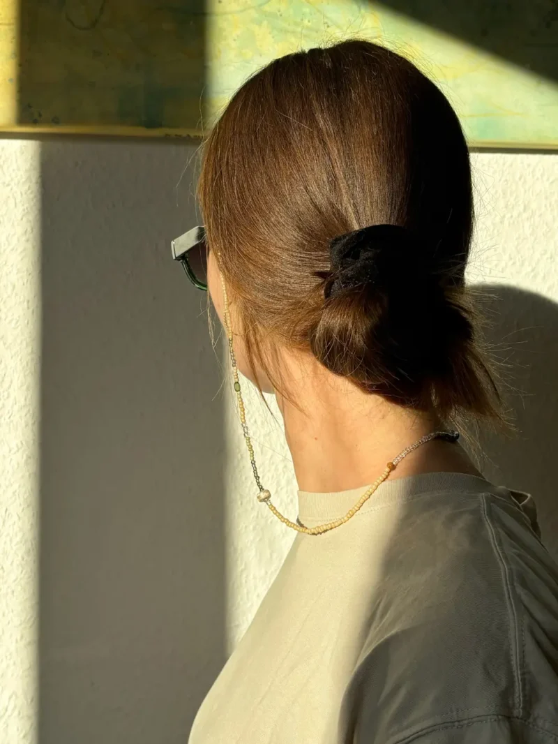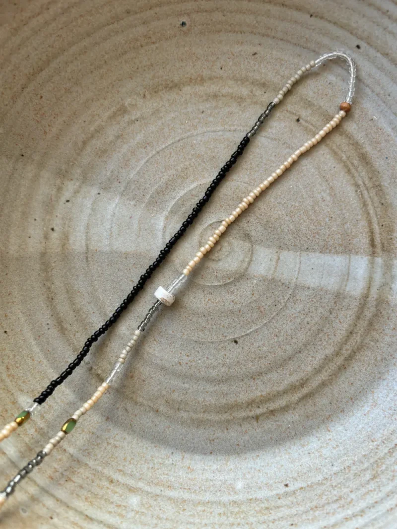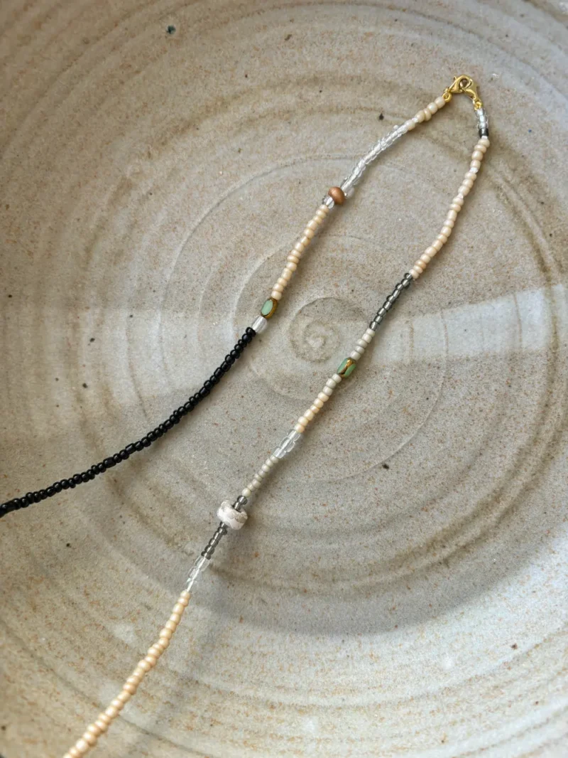 Brillenkette Luca besteht hauptsächlich aus schönen Naturfarbtönen. Creme, braun und beige bilden die Hauptbestandteile und ein schwarzer längerer Abschnitt bildet einen schönen Kontrast dazu. Die Besonderheit sind zwei grün-goldfarbene Perlen und eine bewegliche Keramikperle, die über einen Abschnitt mit vielen kleinen cremefarbenen Perlen hinübergleiten kann.