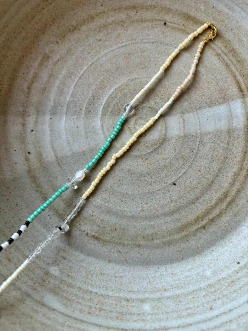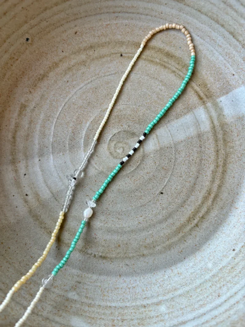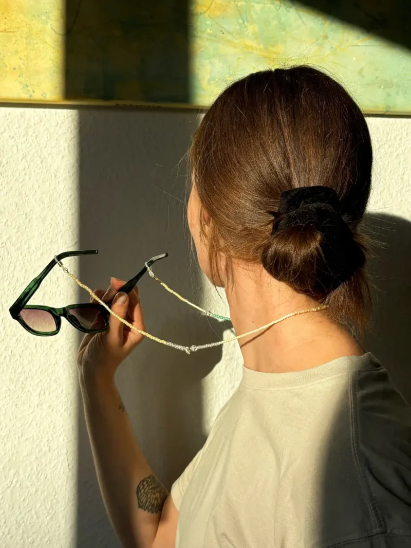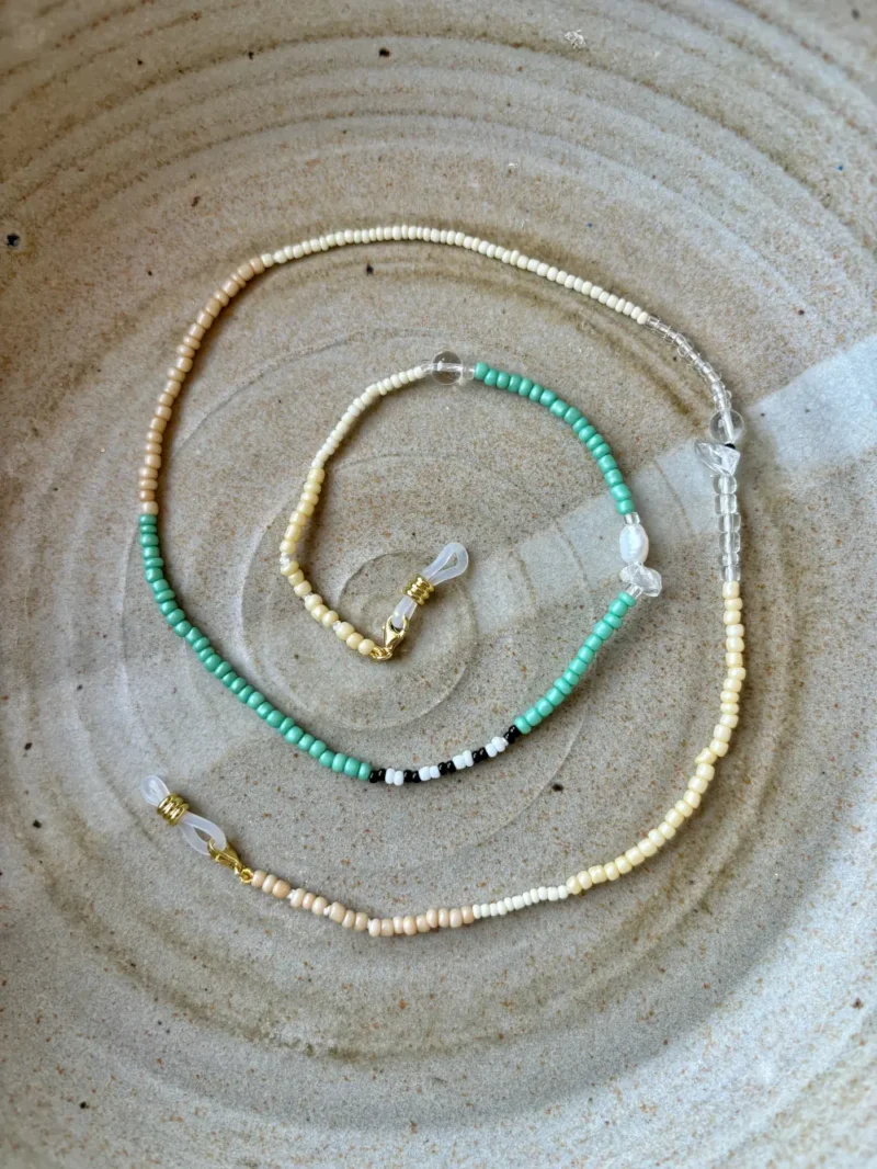 Mara ist eine Freundin des Meeres. Das Türkis und die hellen Farben haben einen maritimen Charakter und die Farbkombination erinnert ein bisschen an Strand. Die kleine barocke Perle und die eingearbeiteten Bergkristalle unterstützen dieses Meerfeeling noch mehr. Mara hat einen kleinen schwarz-weiß Abschnitt im Türkisbereich, der einen tollen Kontrast bildet. Mara passt zum Beispiel gut zu naturfarbenen oder zurückhaltenderen Brillen.