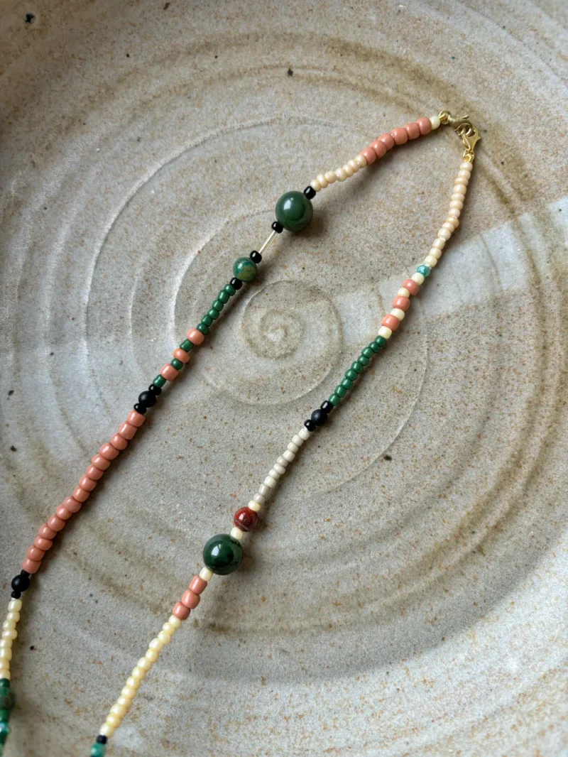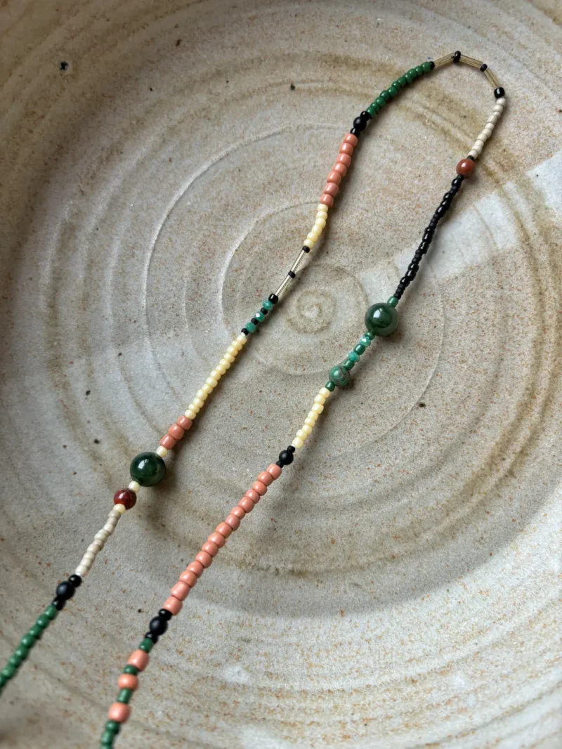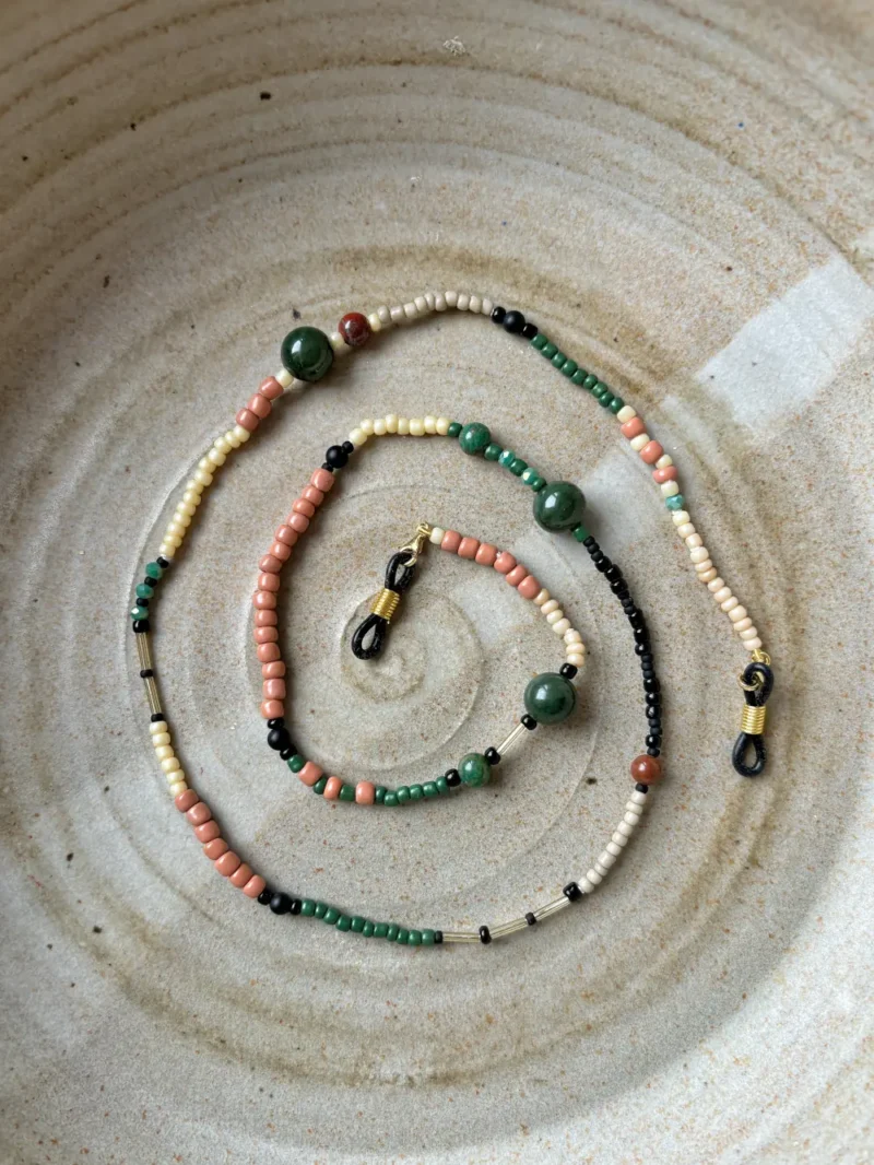 Brillenkette Samira ist grün und rot und schwarz und cremefarben. Drei große dunkelgrüne Farbsteine bilden die Highlights und machen Samira zu einer ganz besonderen Brillenkette. Dunkelgrün ist immer mega angesagt und einfach eine tolle Farbe. Zusammen mit den schwarzen matten Abschnitten und im Kontrast zu den roten Akzenten zählt Brillenkette Samira schon eher zu den schickeren Modellen. Das heißt nicht, dass sie nicht auch total lässig kombiniert werden kann.