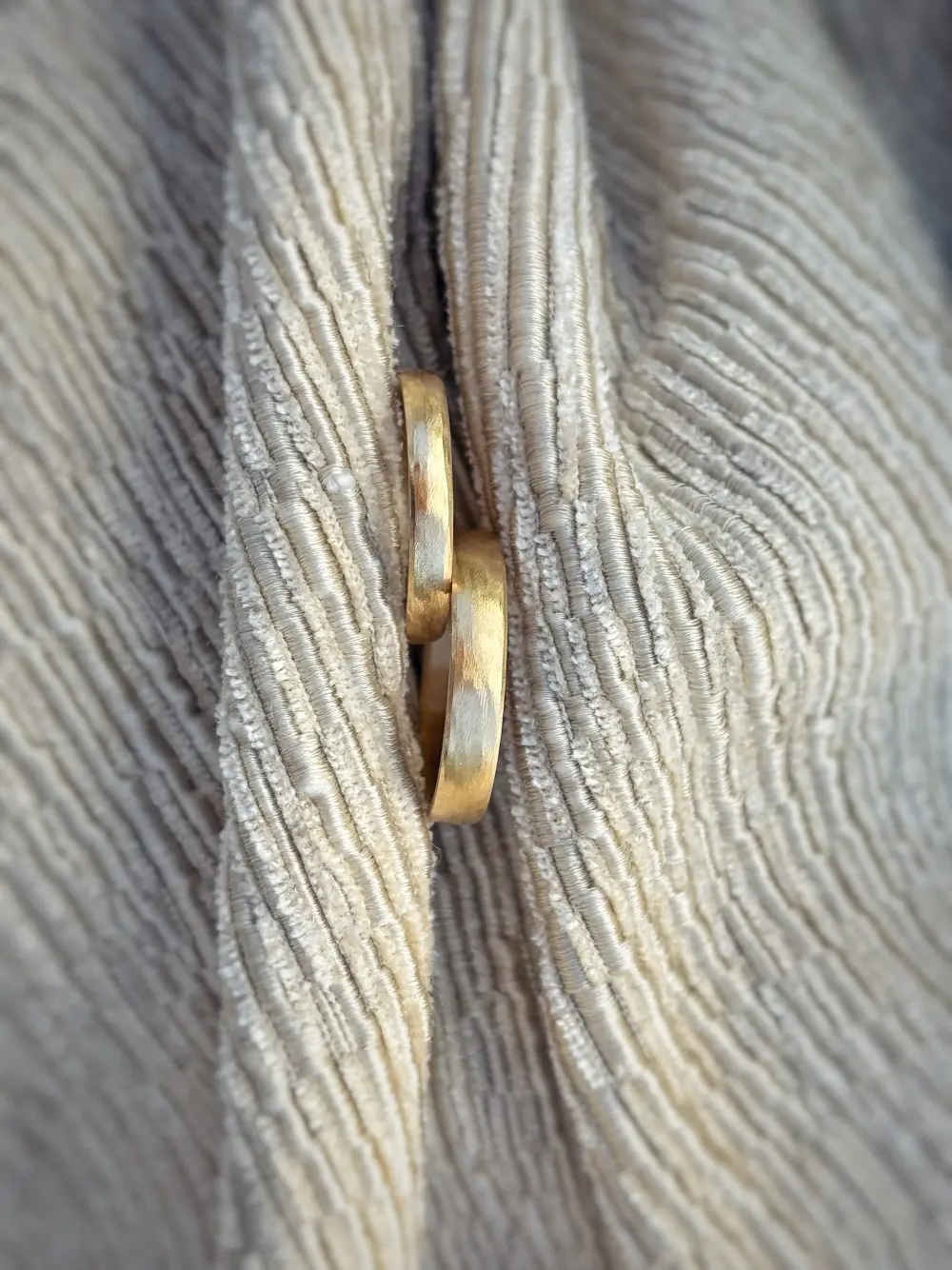 Die kleinen Wellen sind eine ganz sanfte und klassische Oberflächengestaltung für Trauringe. Mit einer feinen Goldschmiede Feile werden die kleinen Wellen mit dem Ring in eine Richtung ein gefeilt. So entsteht ein gleichmäßiges aber dennoch organisches Muster, das weder aufdringlich noch gewöhnlich ist.