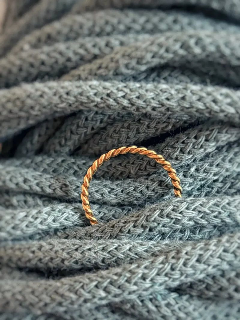 Martha ist ein zarter, schlichter und eleganter Kordelring. Einen Kordelring kannst du super kombinieren mit anderen Ringen oder einfach alleine am Finger tragen. Er ist sehr zart und daher etwas empfindlicher als kräftigere Ringe. Zu schweren Arbeiten mit den Händen wäre es deshalb gut, wenn du Martha beiseite legen würdest, damit sie sich nicht verbiegt 🙂
