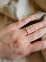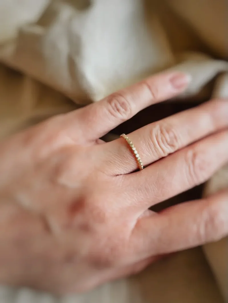 Pina ist ein flach geschmiedeter, sanft mattierter Kugelring. Der Ring besteht also nicht mehr aus kleinen aneinander gereihten Kugeln, sondern eher aus flachen kleinen Scheibchen. Das sieht total schön aus und man kann Pina richtig gut zu einem zweiten Ring am selben Finger kombinieren (das siehst du auch auf einem der Fotos mit Ring Lian, dem feinen kleinen personalisierbaren Siegelring). Du kannst Pina aber auch einzeln tragen. So wirkt er sehr fein und zart. Durch die sanfte Mattierung sieht er sehr zurückhaltend und unaufdringlich aus.